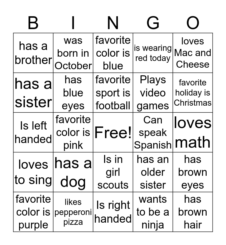 This bingo card has a free space and 24 words: has a dog, likes pepperoni pizza, favorite sport is football, favorite color is purple, loves Mac and Cheese, has a brother, has a sister, was born in October, Can speak Spanish, Is in girl scouts, Plays video games, Is left handed, has an older sister, has brown eyes, has blue eyes, wants to be a ninja, loves math, favorite color is blue, favorite holiday is Christmas, favorite color is pink, has brown hair, loves to sing, is wearing red today and Is right handed.