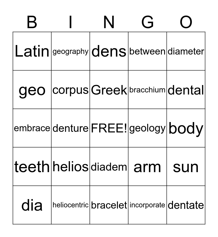 This bingo card has a free space and 24 words: helios, heliocentric, Greek, dia, diameter, Latin, geo, geography, geology, diadem, bracchium, embrace, arm, sun, corpus, incorporate, body, dens, dental, denture, dentate, teeth, between and bracelet.