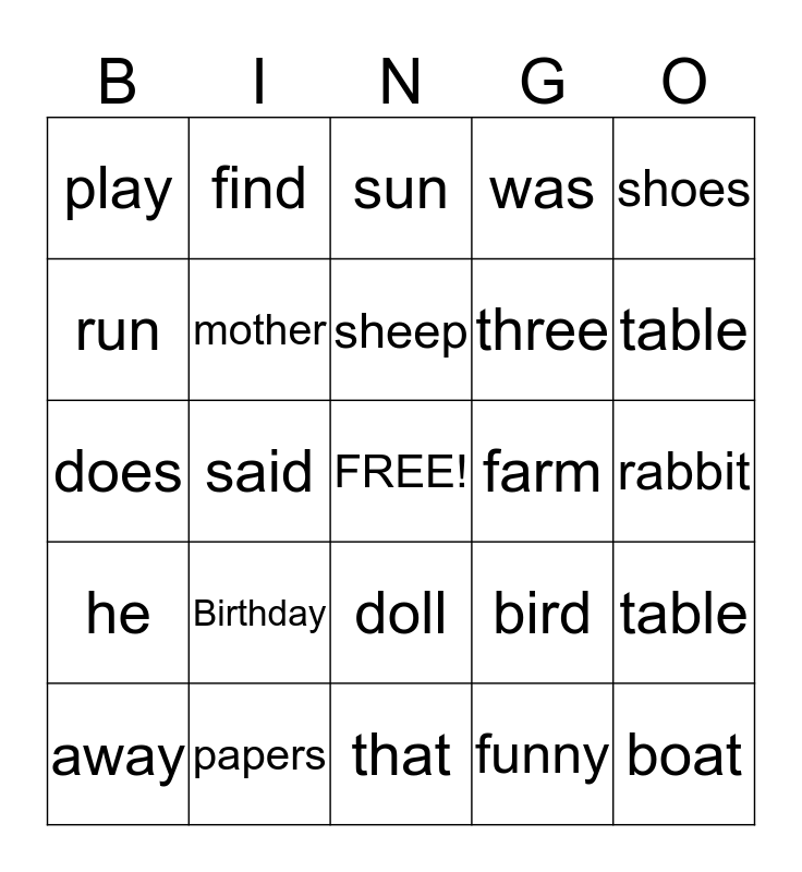 This bingo card has a free space and 24 words: Birthday, papers, sheep, away, shoes, play, run, find, farm, doll, three, does, bird, table, mother, funny, rabbit, sun, table, said, boat, he, was and that.