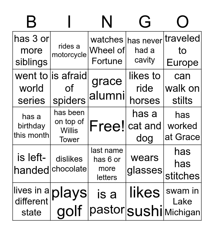 This bingo card has a free space and 24 words: dislikes chocolate, plays golf, grace alumni, lives in a different state, traveled to Europe, has 3 or more siblings, went to world series, rides a motorcycle, has a cat and dog, last name has 6 or more letters, likes to ride horses, has a birthday this month, wears glasses, has has stitches, is afraid of spiders, likes sushi, has worked at Grace, watches Wheel of Fortune, can walk on stilts, has been on top of Willis Tower, swam in Lake Michigan, is left- handed, has never had a cavity and is a pastor.
