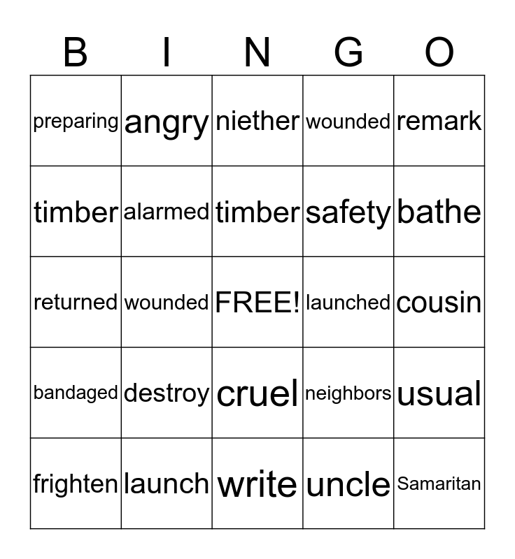 This bingo card has a free space and 24 words: destroy, launch, timber, frighten, remark, preparing, timber, angry, launched, cruel, safety, returned, neighbors, usual, alarmed, uncle, cousin, niether, bathe, wounded, Samaritan, bandaged, wounded and write.