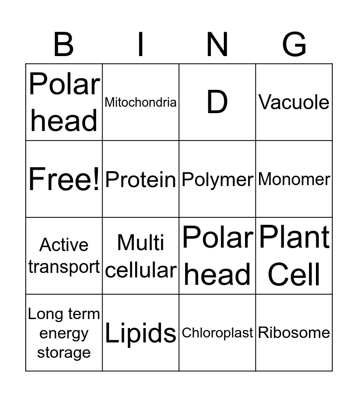 This bingo card has 16 words: Lipids, Plant Cell, D, Polar head, Active transport, Mitochondria, Polar head, Chloroplast, Free!, Protein, Long term energy storage, Vacuole, Multi cellular, Monomer, Polymer and Ribosome.