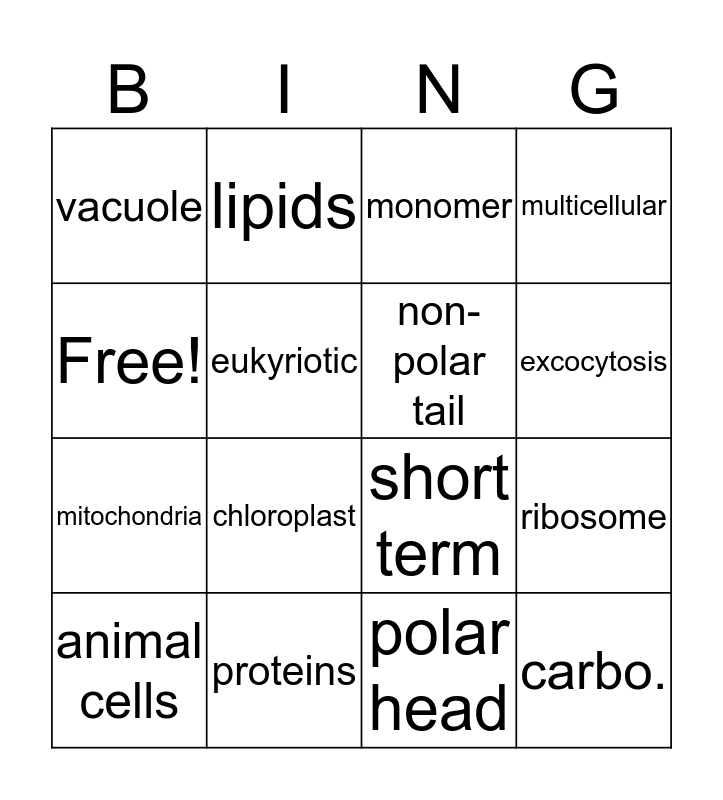 This bingo card has 16 words: proteins, ribosome, monomer, vacuole, mitochondria, lipids, short term, polar head, Free!, eukyriotic, animal cells, multicellular, chloroplast, excocytosis, non-polar tail and carbo..