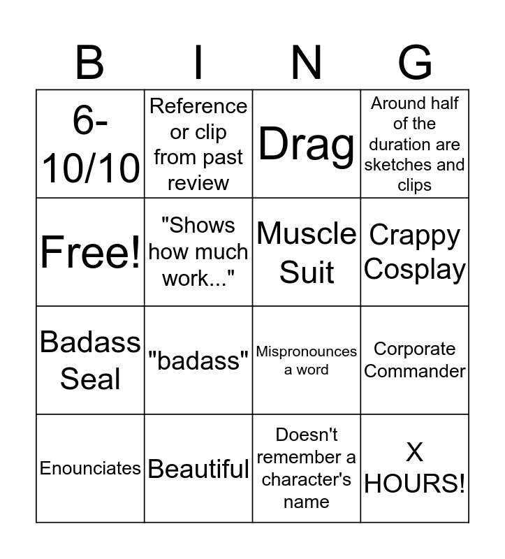 This bingo card has 16 words: Beautiful, Corporate Commander, Drag, 6-10/10, Badass Seal, Reference or clip from past review, Mispronounces a word, Doesn't remember a character's name, Free!, "Shows how much work...", Enounciates, Around half of the duration are sketches and clips, "badass", Crappy Cosplay, Muscle Suit and X HOURS!.
