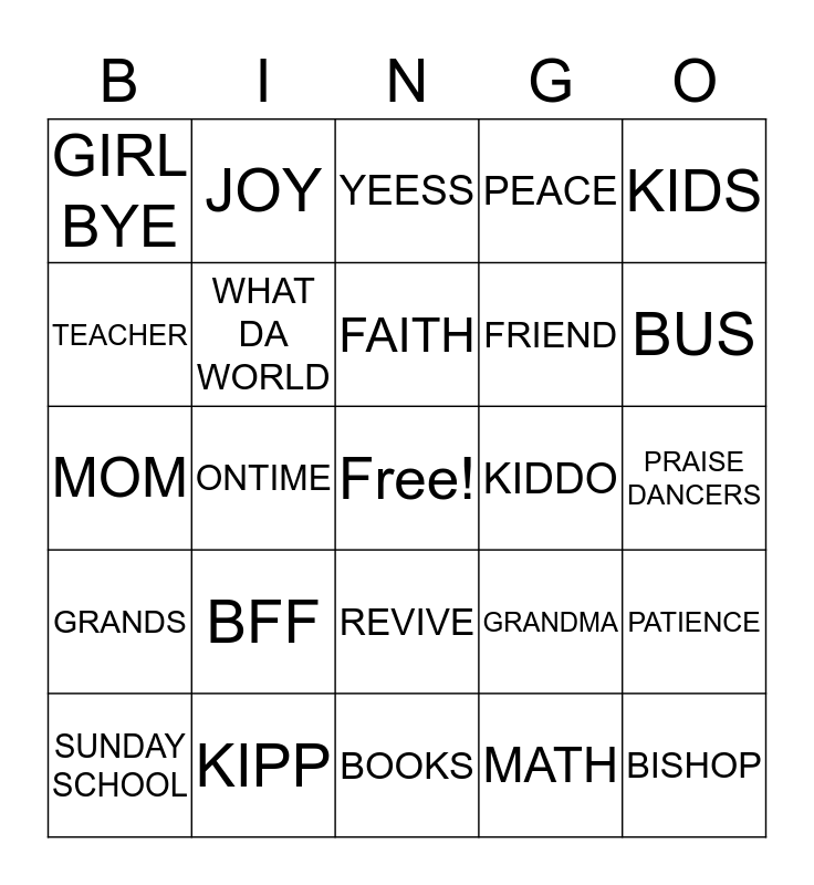 This bingo card has a free space and 29 words: SUNDAY SCHOOL, EARLY, ONTIME, LAUGH, GIRL BYE, YEESS, WHAT DA WORLD, BFF, KIDDO, KIPP, PRAISE DANCERS, BISHOP, BOOKS, MATH, BUS, HELPER, REVIVE, GRANDS, KIDS, MOM, GRANDMA, LOVE, FRIEND, TEACHER, PEACE, JOY, PATIENCE, FAITH and HOPE.