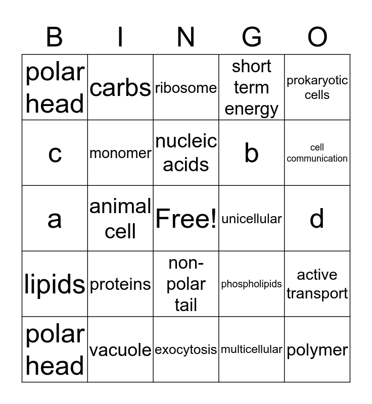 This bingo card has a free space and 24 words: proteins, vacuole, nucleic acids, polar head, prokaryotic cells, polar head, c, carbs, unicellular, non-polar tail, b, a, phospholipids, active transport, monomer, multicellular, d, ribosome, cell communication, animal cell, polymer, lipids, short term energy and exocytosis.