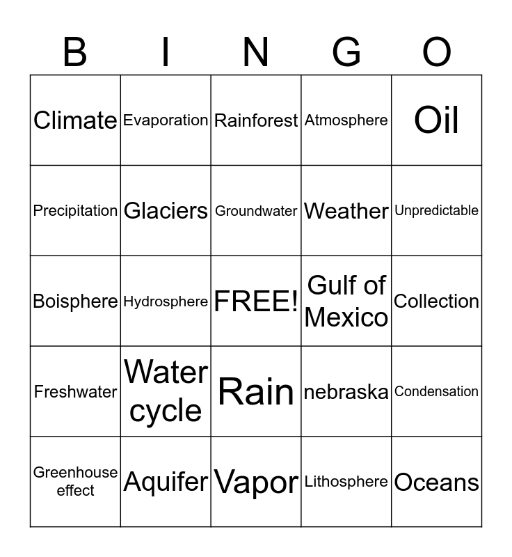 This bingo card has a free space and 24 words: Water cycle, Aquifer, Groundwater, Greenhouse effect, Oil, Climate, Precipitation, Evaporation, Gulf of Mexico, Rain, Weather, Boisphere, nebraska, Condensation, Glaciers, Lithosphere, Collection, Rainforest, Unpredictable, Hydrosphere, Oceans, Freshwater, Atmosphere and Vapor.