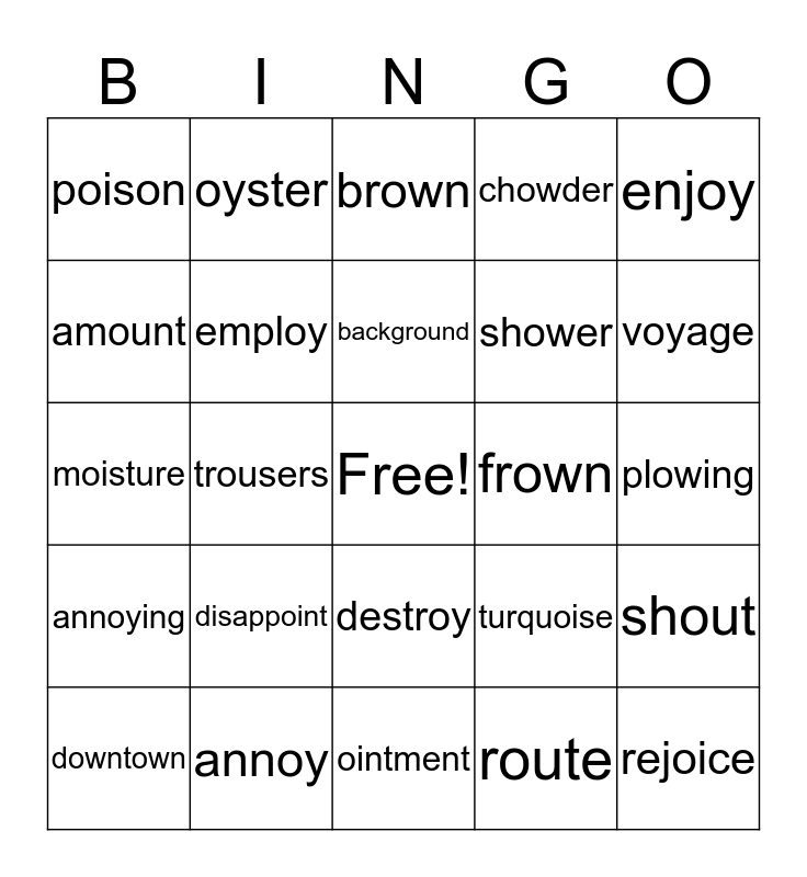 This bingo card has a free space and 24 words: disappoint, annoy, background, downtown, enjoy, poison, amount, oyster, frown, destroy, shower, moisture, turquoise, shout, employ, route, plowing, brown, voyage, trousers, rejoice, annoying, chowder and ointment.