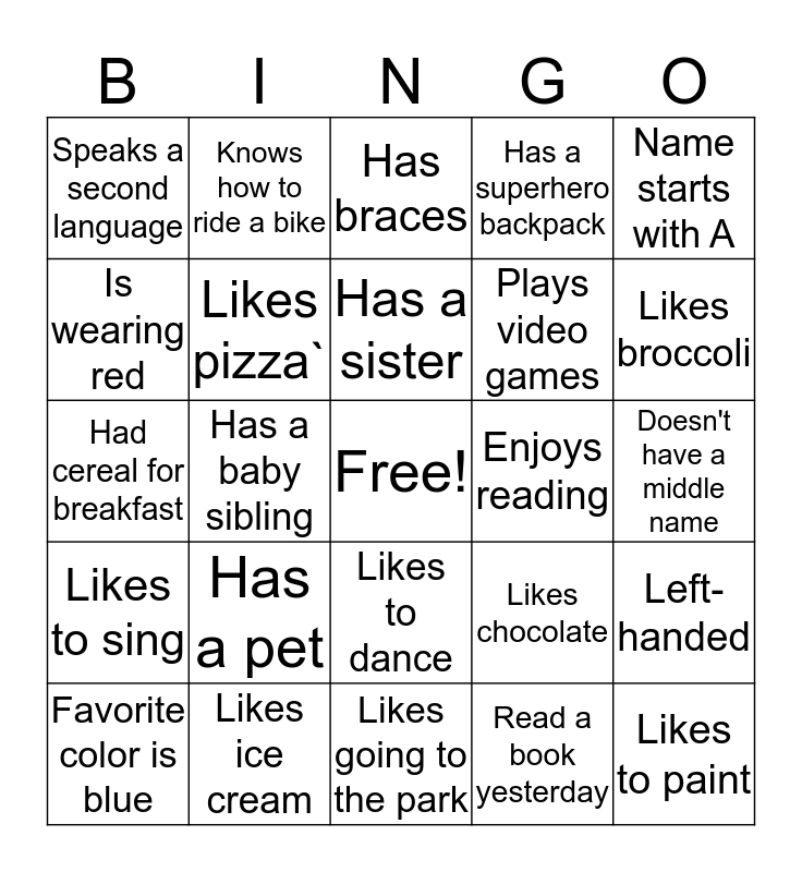 This bingo card has a free space and 24 words: Has a pet, Likes ice cream, Has a sister, Favorite color is blue, Name starts with A, Speaks a second language, Is wearing red, Knows how to ride a bike, Enjoys reading, Likes to dance, Plays video games, Had cereal for breakfast, Likes chocolate, Left-handed, Likes pizza`, Read a book yesterday, Doesn't have a middle name, Has braces, Likes broccoli, Has a baby sibling, Likes to paint, Likes to sing, Has a superhero backpack and Likes going to the park.