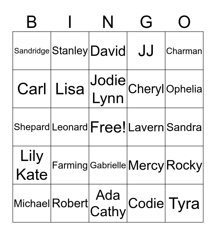 This bingo card has a free space and 24 words: Farming, Robert, Jodie Lynn, Michael, Charman, Sandridge, Carl, Stanley, Lavern, Gabrielle, Cheryl, Shepard, Mercy, Rocky, Lisa, Codie, Sandra, David, Ophelia, Leonard, Tyra, Lily Kate, JJ and Ada Cathy.