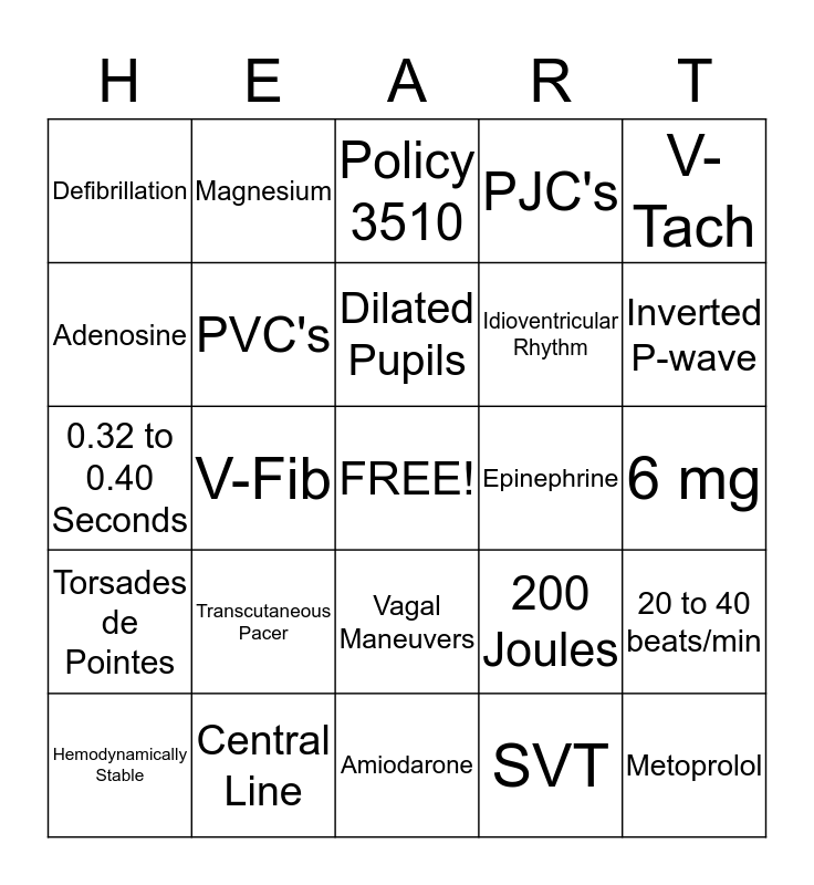 This bingo card has a free space and 24 words: Transcutaneous Pacer, Central Line, Dilated Pupils, Hemodynamically Stable, V-Tach, Defibrillation, Adenosine, Magnesium, Epinephrine, Vagal Maneuvers, Idioventricular Rhythm, 0.32 to 0.40 Seconds, 200 Joules, 20 to 40 beats/min, PVC's, SVT, 6 mg, Policy 3510, Inverted P-wave, V-Fib, Metoprolol, Torsades de Pointes, PJC's and Amiodarone.