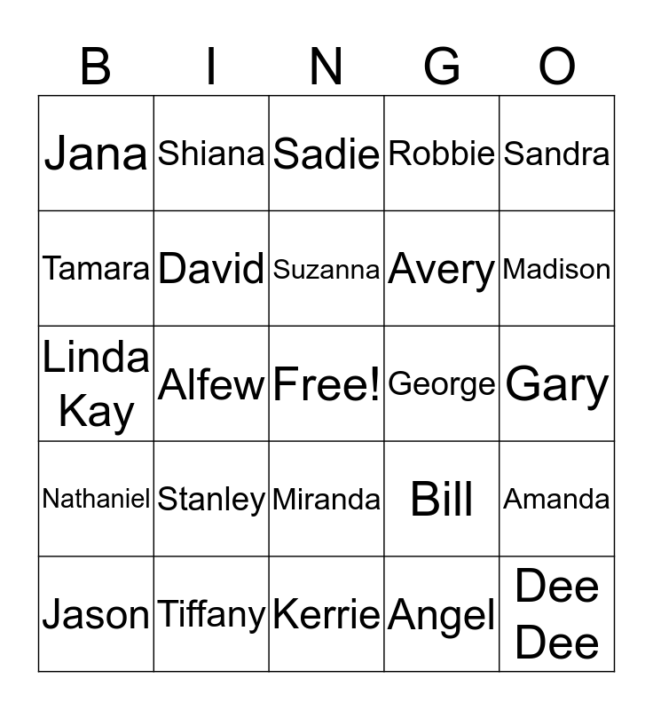 This bingo card has a free space and 24 words: Stanley, Tiffany, Suzanna, Jason, Sandra, Jana, Tamara, Shiana, George, Miranda, Avery, Linda Kay, Bill, Amanda, David, Angel, Gary, Sadie, Madison, Alfew, Dee Dee, Nathaniel, Robbie and Kerrie.