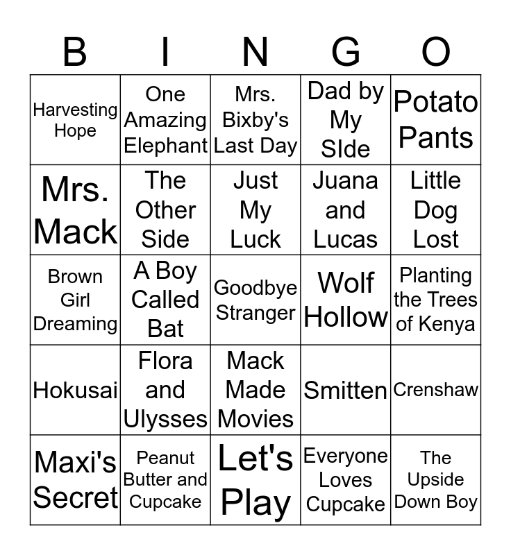 This bingo card has 30 words: Peanut Butter and Cupcake, You Forgot Your Skirt Amelia, A Boy Called Bat, Click Clack Surprise, Harvesting Hope, Mrs. Bixby's Last Day, The Other Side, Mack Made Movies, Wolf Hollow, Let's Play, Planting the Trees of Kenya, Goodbye Stranger, Everyone Loves Cupcake, The Upside Down Boy, Little Dog Lost, The Wild Robot, Smitten, Hokusai, Flora and Ulysses, Potato Pants, Brown Girl Dreaming, Soar Elinor, One Amazing Elephant, Juana and Lucas, Mrs. Mack, Dad by My SIde, Crenshaw, Maxi's Secret, Just My Luck and Gossamer.