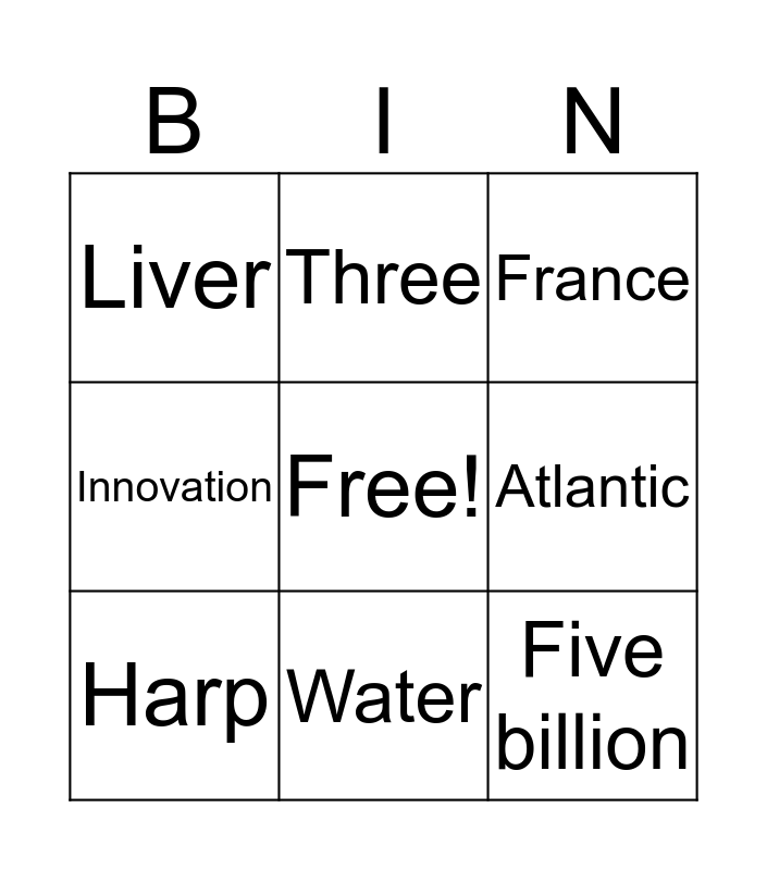 This bingo card has a free space and 15 words: Mark Twain, Seven, France, Liver, Water, Five billion, Learning and decision making, Pacific, Atlantic, 1999, 4th, Innovation, Harp, Three and Pluto.
