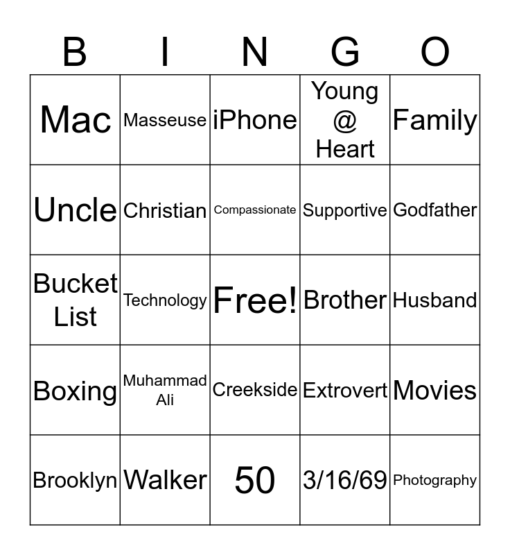 This bingo card has a free space and 29 words: Brooklyn, Son, Technology, Friend, Mac, iPhone, Christian, Muhammad Ali, Brother, Walker, Husband, Photography, 50, 3/16/69, Godfather, Happy Birthday!, Creekside, Boxing, Family, Bucket List, Extrovert, Travel, Supportive, Uncle, Young @ Heart, Masseuse, Movies, Compassionate and Winfred.