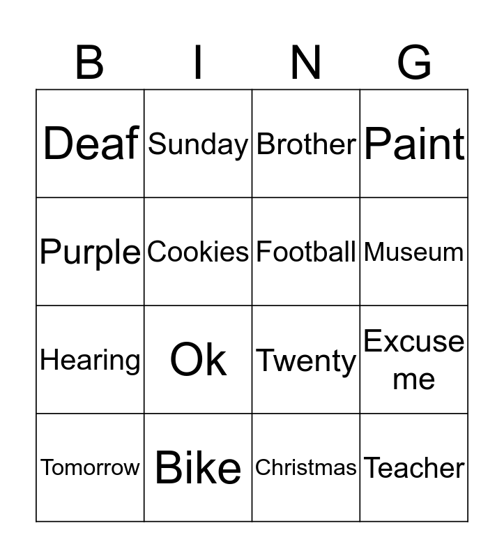 This bingo card has 46 words: Yesterday, Tomorrow, Later, Never, Year, Friday, Sunday, Summer, Cookies, Fall, Football, Paint, Watch TV, Cook, Dance, Car/Drive, Museum, Bike, Travel, Purple, Excuse me, Thank you, Deaf, Hearing, How are you?, Ok, Fun, Study, Homework, Teacher, Science, Thanksgiving, Shoes, Date, Married, Glasses, Christmas, Grandfather, Dad, Woman, Friend, Brother, Twenty, Ninety-nine, Sixty-eight and Girl.