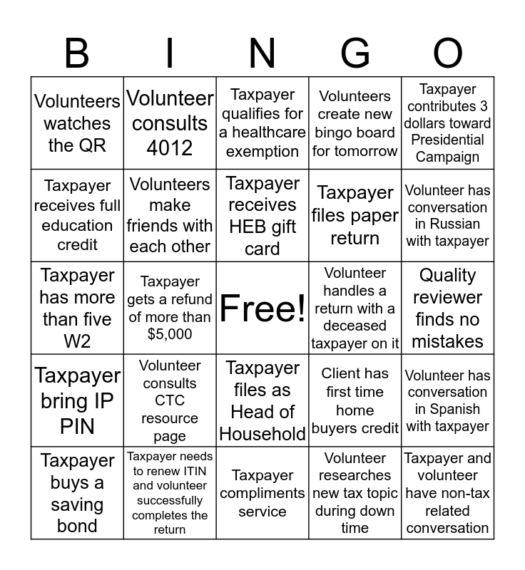 This bingo card has a free space and 24 words: Volunteer consults CTC resource page, Taxpayer needs to renew ITIN and volunteer successfully completes the return, Taxpayer receives HEB gift card, Taxpayer buys a saving bond, Taxpayer contributes 3 dollars toward Presidential Campaign, Volunteers watches the QR, Taxpayer receives full education credit, Volunteer consults 4012, Volunteer handles a return with a deceased taxpayer on it, Taxpayer files as Head of Household, Taxpayer files paper return, Taxpayer has more than five W2, Client has first time home buyers credit, Volunteer has conversation in Spanish with taxpayer, Volunteers make friends with each other, Volunteer researches new tax topic during down time, Quality reviewer finds no mistakes, Taxpayer qualifies for a healthcare exemption, Volunteer has conversation in Russian with taxpayer, Taxpayer gets a refund of more than $5,000, Taxpayer and volunteer have non-tax related conversation, Taxpayer bring IP PIN, Volunteers create new bingo board for tomorrow and Taxpayer compliments service.