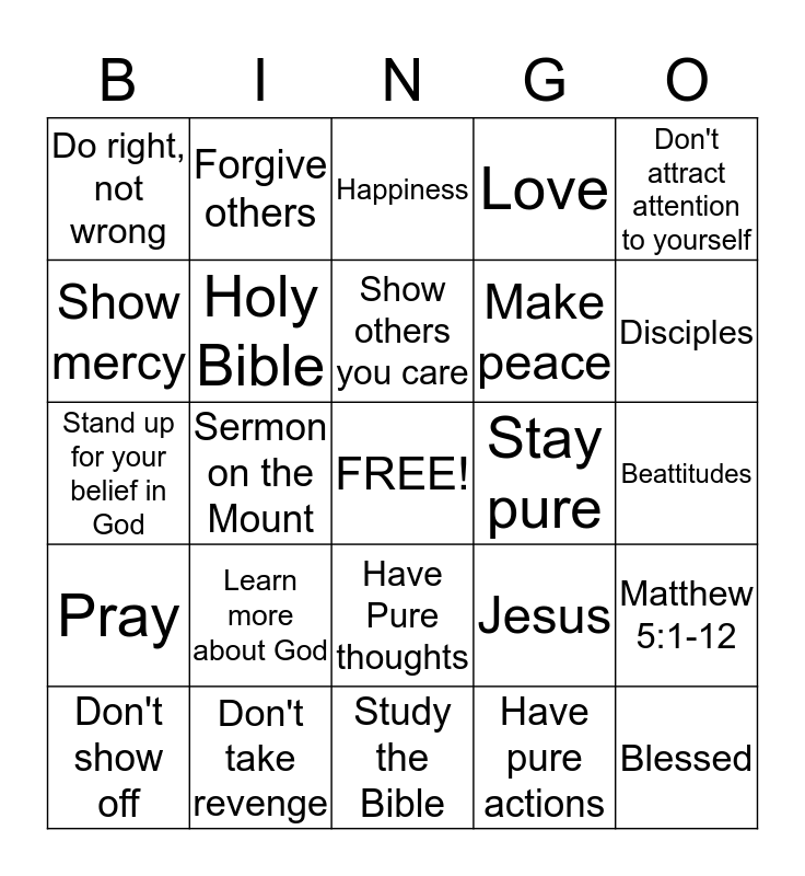 This bingo card has a free space and 24 words: Learn more about God, Don't take revenge, Show others you care, Don't show off, Don't attract attention to yourself, Do right, not wrong, Show mercy, Forgive others, Stay pure, Have Pure thoughts, Make peace, Stand up for your belief in God, Jesus, Matthew 5:1-12, Holy Bible, Have pure actions, Beattitudes, Happiness, Disciples, Sermon on the Mount, Blessed, Pray, Love and Study the Bible.