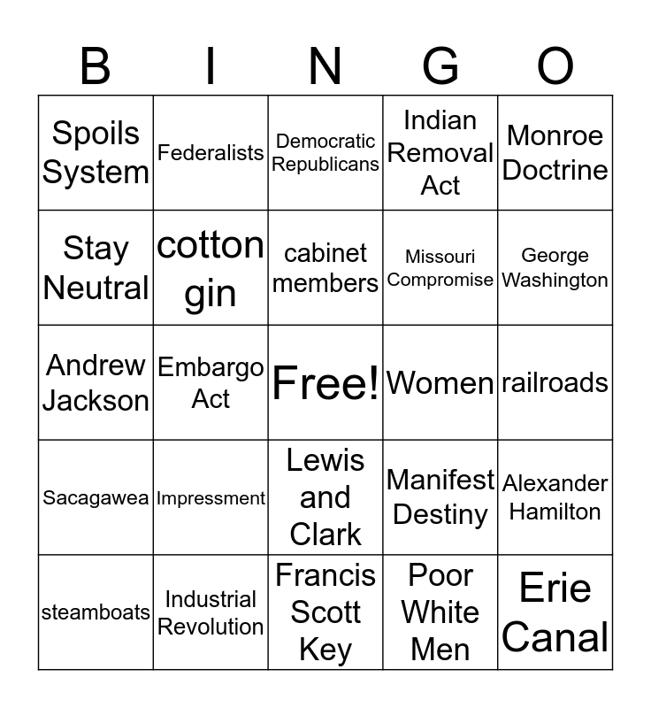 This bingo card has a free space and 24 words: Impressment, Industrial Revolution, cabinet members, steamboats, Monroe Doctrine, Spoils System, Stay Neutral, Federalists, Women, Lewis and Clark, Missouri Compromise, Andrew Jackson, Manifest Destiny, Alexander Hamilton, cotton gin, Poor White Men, railroads, Democratic Republicans, George Washington, Embargo Act, Erie Canal, Sacagawea, Indian Removal Act and Francis Scott Key.
