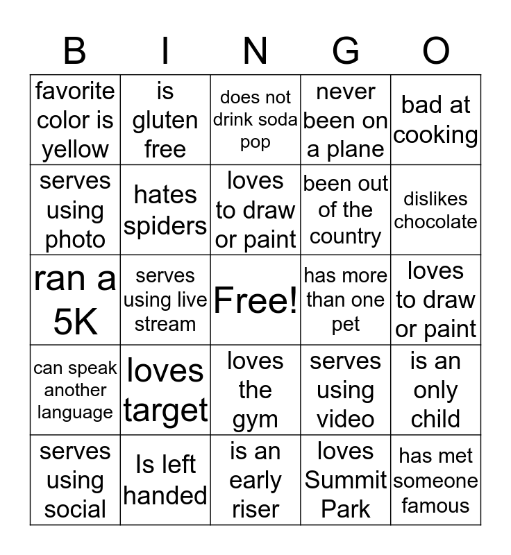 This bingo card has a free space and 24 words: loves target, Is left handed, loves to draw or paint, serves using social, bad at cooking, favorite color is yellow, serves using photo, is gluten free, has more than one pet, loves the gym, been out of the country, ran a 5K, serves using video, is an only child, hates spiders, loves Summit Park, loves to draw or paint, does not drink soda pop, dislikes chocolate, serves using live stream, has met someone famous, can speak another language, never been on a plane and is an early riser.