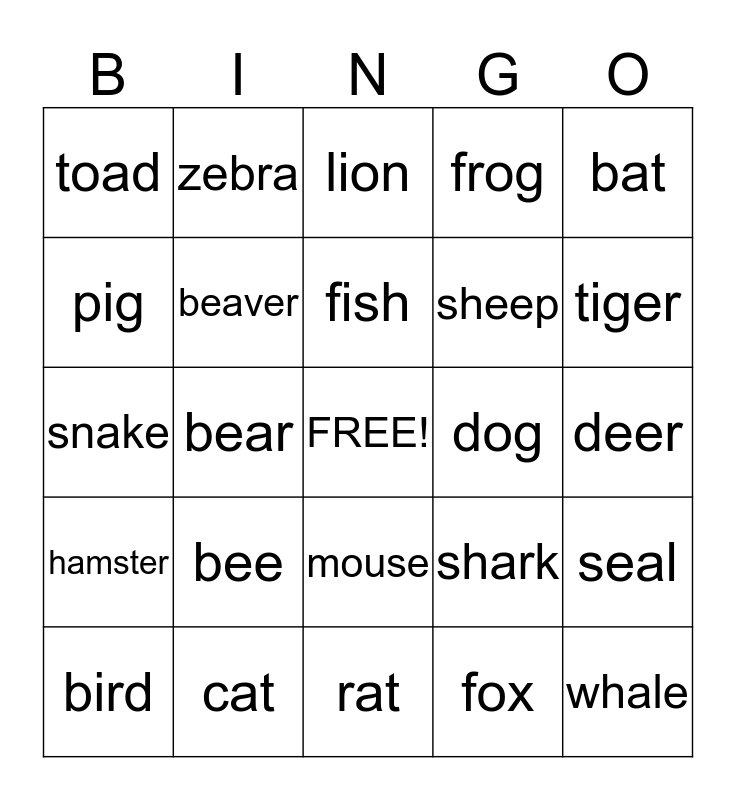 This bingo card has a free space and 24 words: bee, cat, fish, bird, bat, toad, pig, zebra, dog, mouse, sheep, snake, shark, seal, beaver, fox, deer, lion, tiger, bear, whale, hamster, frog and rat.