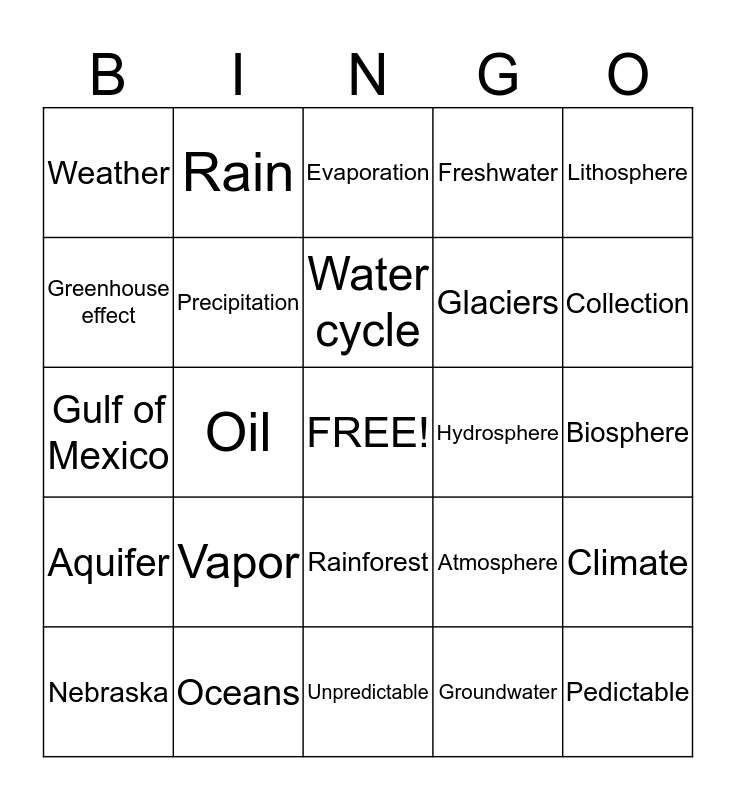 This bingo card has a free space and 24 words: Vapor, Oceans, Water cycle, Nebraska, Lithosphere, Weather, Greenhouse effect, Rain, Hydrosphere, Rainforest, Glaciers, Gulf of Mexico, Atmosphere, Climate, Precipitation, Groundwater, Biosphere, Evaporation, Collection, Oil, Pedictable, Aquifer, Freshwater and Unpredictable.