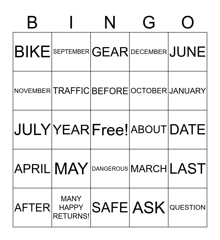 This bingo card has a free space and 30 words: MANY HAPPY RETURNS!, AUGUST, YEAR, PRESENT, BIKE, GEAR, TRAFFIC, DANGEROUS, ABOUT, SAFE, DATE, QUESTION, ASK, SPECIAL, JANUARY, FEBRUARY, MARCH, APRIL, MAY, JUNE, JULY, AUGUST, SEPTEMBER, OCTOBER, NOVEMBER, DECEMBER, LAST, AFTER, BEFORE and PARENT.
