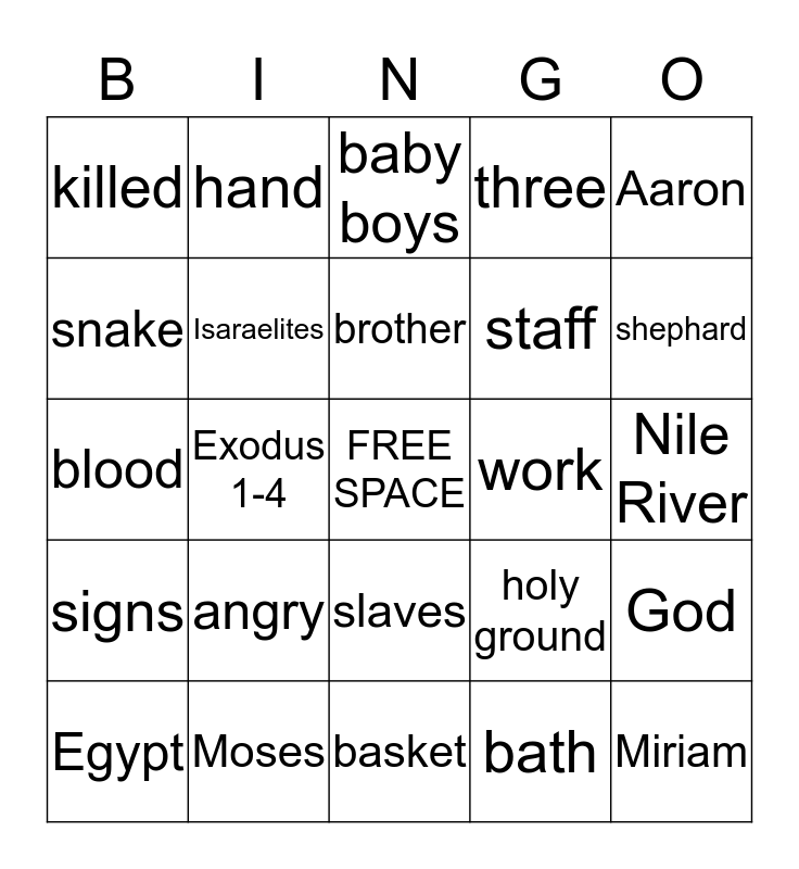 This bingo card has a free space and 30 words: Moses, born, Exodus 1-4, Pharaoh, killed, baby boys, Isaraelites, slaves, work, basket, Nile River, Miriam, bath, daughter, shephard, burning bush, holy ground, signs, angry, Aaron, blood, water, hand, staff, snake, three, God, Egypt, brother and I AM.