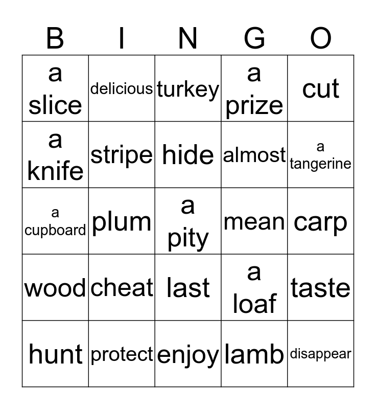 This bingo card has a free space and 24 words: cheat, protect, hide, hunt, cut, a slice, a knife, delicious, mean, last, almost, a cupboard, a loaf, taste, stripe, lamb, carp, turkey, a tangerine, plum, disappear, wood, a prize and enjoy.