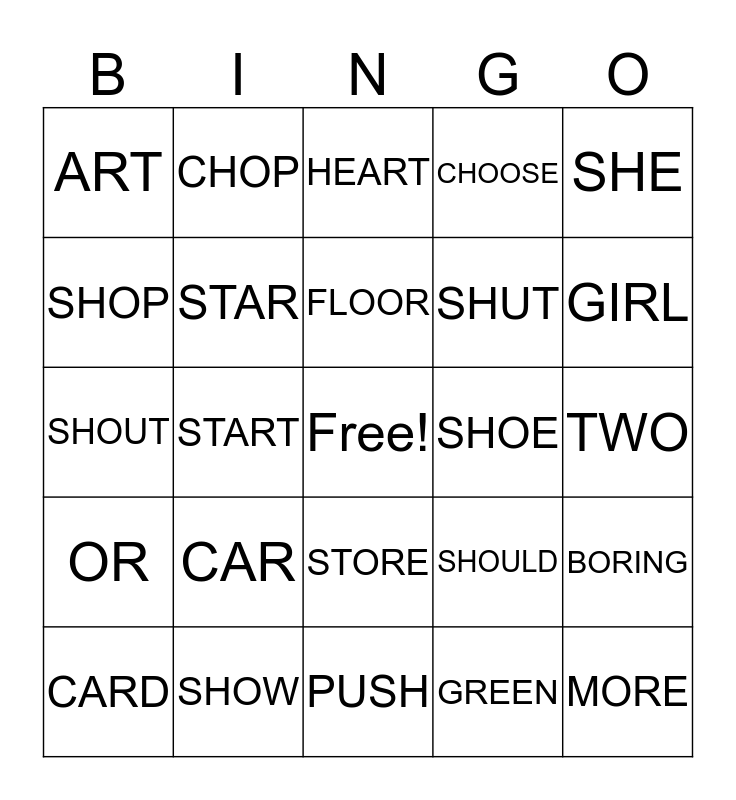 This bingo card has a free space and 29 words: CARD, DART, START, HARD, ART, HEART, STAR, CAR, SHOE, SHOW, TWO, MORE, PUSH, GREEN, GIRL, IRISH, STORE, OR, SHE, SHOUT, SHOULD, PUSH, SHUT, SHOP, CHOOSE, CHOP, BORING, FLOOR and LIAR.
