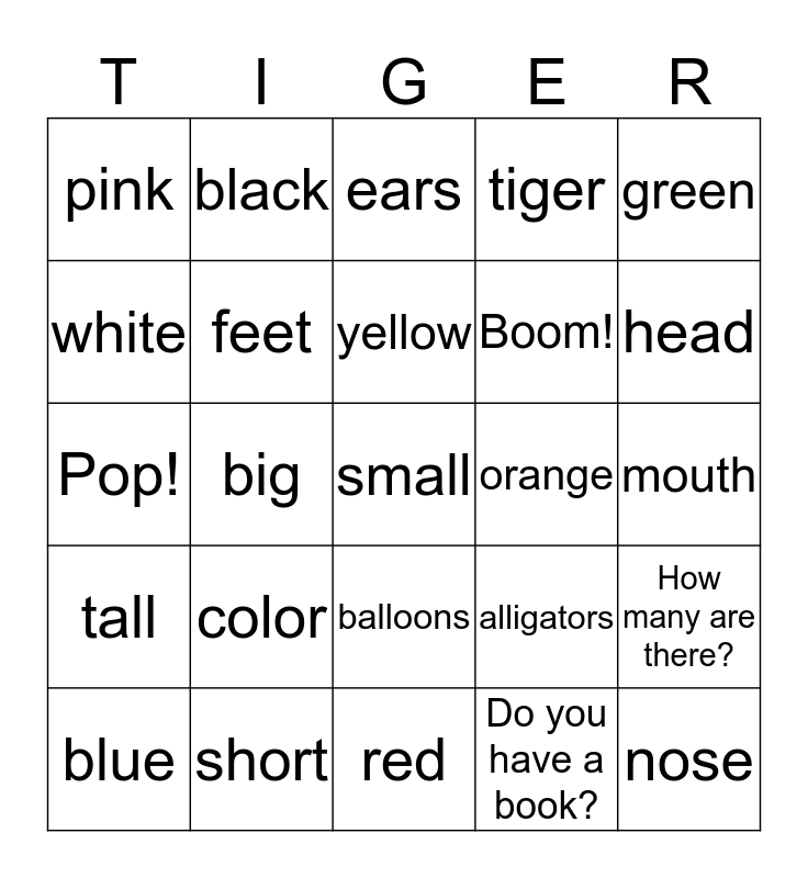 This bingo card has 25 words: color, red, yellow, blue, green, pink, white, black, orange, balloons, Boom!, Pop!, alligators, How many are there?, feet, nose, mouth, ears, head, big, small, short, tall, tiger and Do you have a book?.