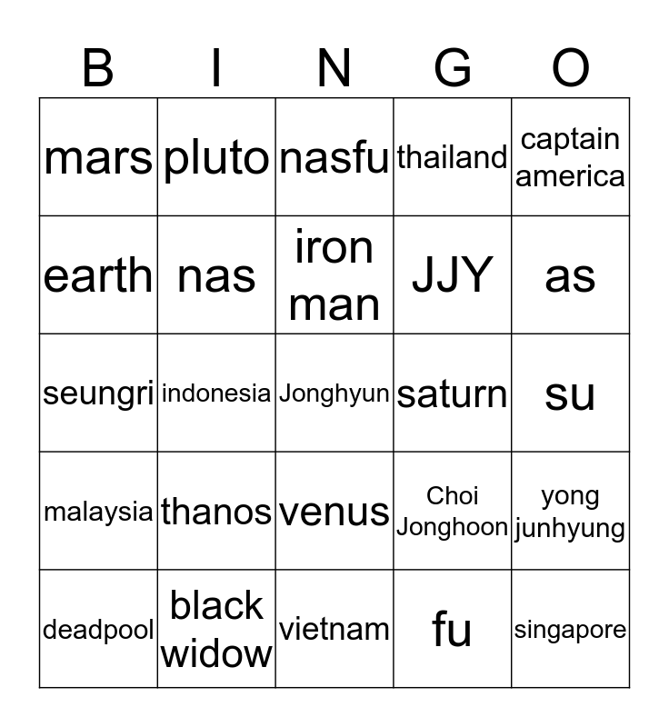 This bingo card has a free space and 24 words: thanos, black widow, iron man, deadpool, captain america, mars, earth, pluto, saturn, venus, JJY, seungri, Choi Jonghoon, yong junhyung, nas, fu, su, nasfu, as, indonesia, singapore, malaysia, thailand and vietnam.