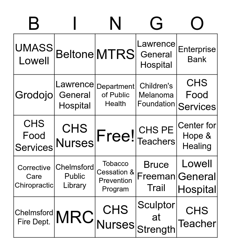 This bingo card has a free space and 42 words: Begin with Skin, Beltone, Brain Injury Foundation, Bruce Freeman Trail, Center for Hope & Healing, Chelmsford Fire Dept., Chelmsford Public Library, Chelmsford Senior Center, Children's Melanoma Foundation, CHS Food Services, CHS Food Services, CHS Nurses, CHS Nurses, CHS PE Teachers, CHS Teacher, Corrective Care Chiropractic, CVS Pharmacy, Department of Public Health, Donate for Life, Enterprise Bank, Grodojo, I Love Kickboxing, Lawrence General Hospital, Lawrence General Hospital, Lawrence General Hospital, Lawrence General Hospital, Lawrence General Hospital, Lawrence General Hospital, LiveSmart, Lowell General Hospital, Merrimack River Rowing Association, MRC, MTRS, Sculptor at Strength, SLS Fitness, Sue Hanly, The Service Dog Project, Tobacco Cessation & Prevention Program, Tranquility Wellness Center, Trinity EMS, UMASS Lowell and Valley Collaborative.