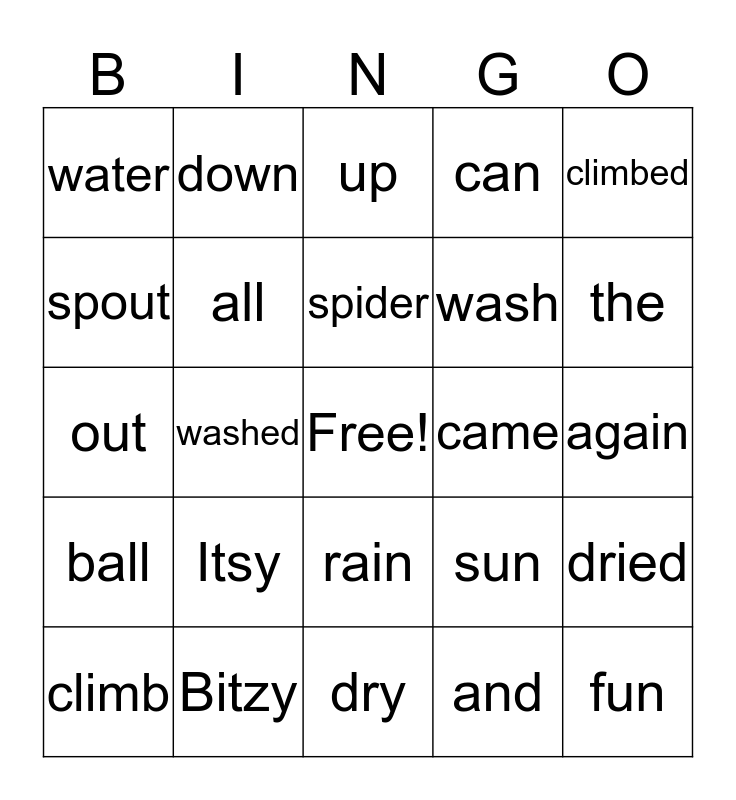 This bingo card has a free space and 24 words: Itsy, Bitzy, spider, climb, climbed, water, spout, down, came, rain, wash, out, sun, dried, all, and, again, up, the, washed, fun, ball, can and dry.