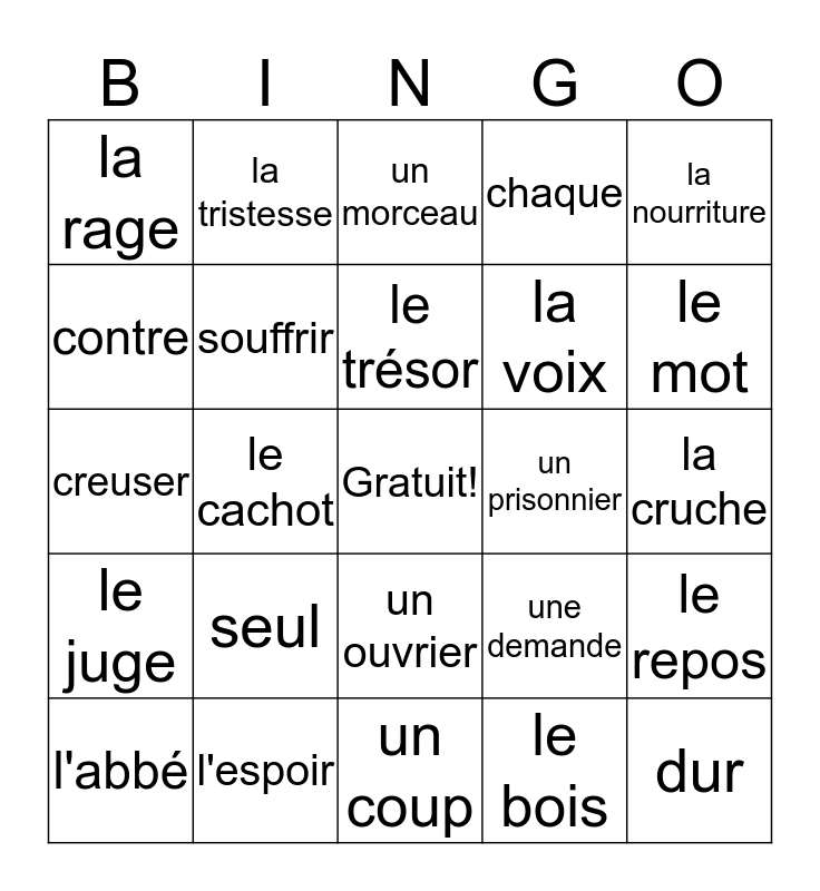 This bingo card has a free space and 29 words: l'abbé, l'assiette, le cachot, le porte-clefs, la rage, un morceau, souffrir, seul, un prisonnier, l'espoir, la cruche, dur, un coup, le bois, le mot, la vérité, un ouvrier, le juge, la nourriture, creuser, une demande, l'esprit, la voix, contre, chaque, la tristesse, le repos, le trésor and par terre.
