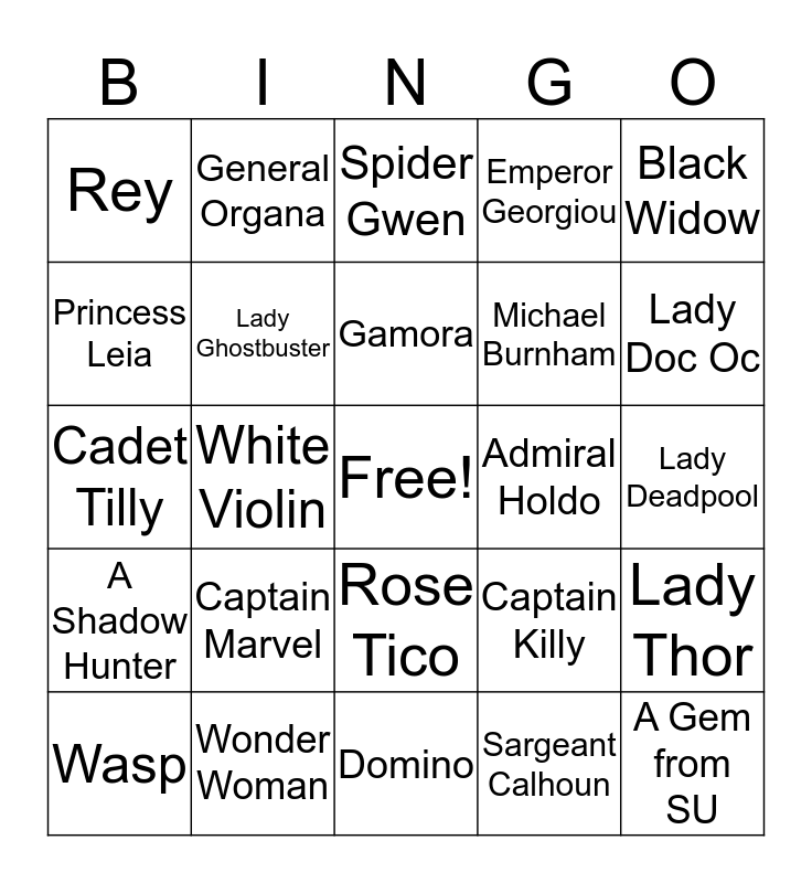 This bingo card has a free space and 24 words: Captain Marvel, Wonder Woman, Gamora, Wasp, Black Widow, Rey, Princess Leia, General Organa, Admiral Holdo, Rose Tico, Michael Burnham, Cadet Tilly, Captain Killy, Lady Thor, Lady Ghostbuster, Sargeant Calhoun, Lady Deadpool, Spider Gwen, Lady Doc Oc, White Violin, A Gem from SU, A Shadow Hunter, Emperor Georgiou and Domino.