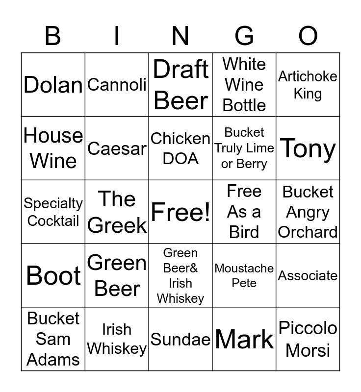 This bingo card has a free space and 24 words: Green Beer, Irish Whiskey, Chicken DOA, Bucket Sam Adams, Artichoke King, Dolan, House Wine, Cannoli, Free As a Bird, Green Beer& Irish Whiskey, Bucket Truly Lime or Berry, Specialty Cocktail, Moustache Pete, Associate, Caesar, Mark, Bucket Angry Orchard, Draft Beer, Tony, The Greek, Piccolo Morsi, Boot, White Wine Bottle and Sundae.
