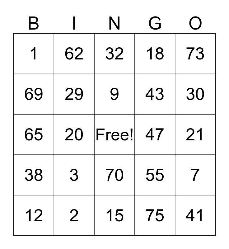 This bingo card has a free space and 24 words: 3, 2, 9, 12, 73, 1, 69, 62, 47, 70, 43, 65, 55, 7, 29, 75, 21, 32, 30, 20, 41, 38, 18 and 15.