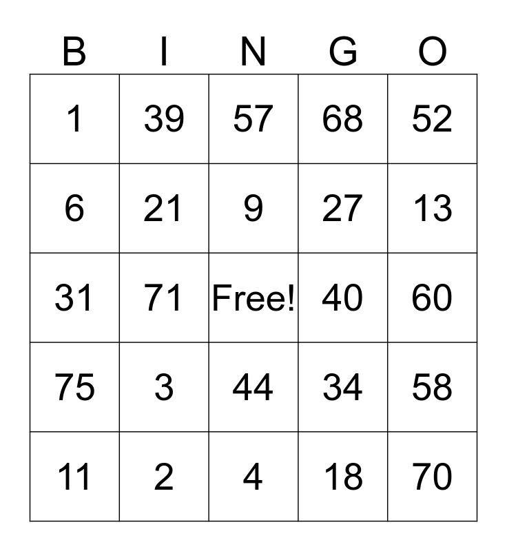 This bingo card has a free space and 24 words: 3, 2, 9, 11, 52, 1, 6, 39, 40, 44, 27, 31, 34, 58, 21, 18, 60, 57, 13, 71, 70, 75, 68 and 4.