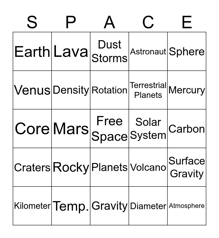 This bingo card has a free space and 24 words: Rocky, Temp., Rotation, Kilometer, Sphere, Earth, Venus, Lava, Solar System, Planets, Terrestrial Planets, Core, Volcano, Surface Gravity, Density, Diameter, Carbon, Dust Storms, Mercury, Mars, Atmosphere, Craters, Astronaut and Gravity.