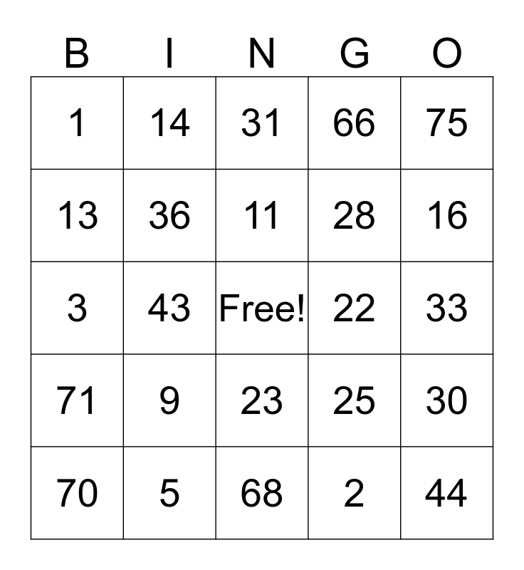 This bingo card has a free space and 24 words: 9, 5, 11, 70, 75, 1, 13, 14, 22, 23, 28, 3, 25, 30, 36, 2, 33, 31, 16, 43, 44, 71, 66 and 68.