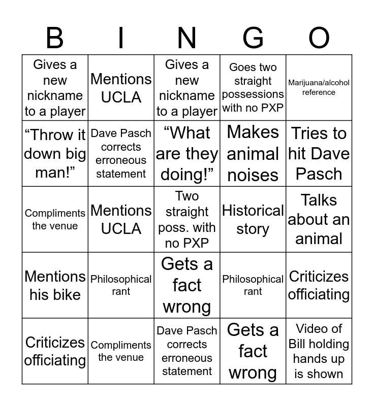 This bingo card has a free space and 54 words: Argues with Pasch, Mentions his bike, Throw it down big man!, Name drops an old teammate, Gets a fact wrong, Gets a fact wrong, Goes two straight possessions with no PXP, Name drops an old teammate, “Throw it down big man!”, Shouts out his wife or sons, Gives a new nickname to a player, Argues with Dave Pasch, Compliments the venue, Criticizes officiating, Uses a sexual innuendo, Dave Pasch corrects erroneous statement, Video of Bill holding hands up is shown, Makes animal noises, “Conference of champions”, Talks about an animal, Philosophical rant, Criticizes young people in general, Historical story, Marijuana/alcohol reference, “What are they doing!”, Mentions UCLA, Tries to hit Dave Pasch, “What’s your name again?”, Grateful dead mention, Gets a fact wrong, Goes two straight possessions with no PXP, Name drops an old teammate, “Throw it down big man!”, Shouts out his wife or sons, Gives a new nickname to a player, Argues with Dave Pasch, Compliments the venue, Criticizes officiating, Uses a sexual innuendo, Dave Pasch corrects erroneous statement, Video of Bill holding hands up is shown, Makes animal noises, “Conference of champions”, Talks about an animal, Philosophical rant, Criticizes young people in general, Historical story, Marijuana/alcohol reference, “What are they doing!”, Mentions UCLA, Tries to hit Dave Pasch, “What’s your name again?”, Grateful dead mention and Says Pac-12 should get 3 bids.