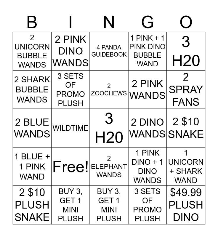 This bingo card has 25 words: Free!, BUY 3, GET 1 MINI PLUSH, 2 ZOOCHEWS, 2 $10 PLUSH SNAKE, 3 H20, 2 UNICORN BUBBLE WANDS, 2 SHARK BUBBLE WANDS, 2 PINK DINO WANDS, 2 DINO WANDS, 2 ELEPHANT WANDS, 2 PINK WANDS, 2 BLUE WANDS, 1 PINK DINO + 1 DINO WANDS, 1 UNICORN + SHARK WAND, 3 SETS OF PROMO PLUSH, $49.99 PLUSH DINO, 2 $10 SNAKE, 4 PANDA GUIDEBOOK, 2 SPRAY FANS, WILDTIME, 3 H20, BUY 3, GET 1 MINI PLUSH, 1 BLUE + 1 PINK WAND, 1 PINK + 1 PINK DINO BUBBLE WAND and 3 SETS OF PROMO PLUSH.
