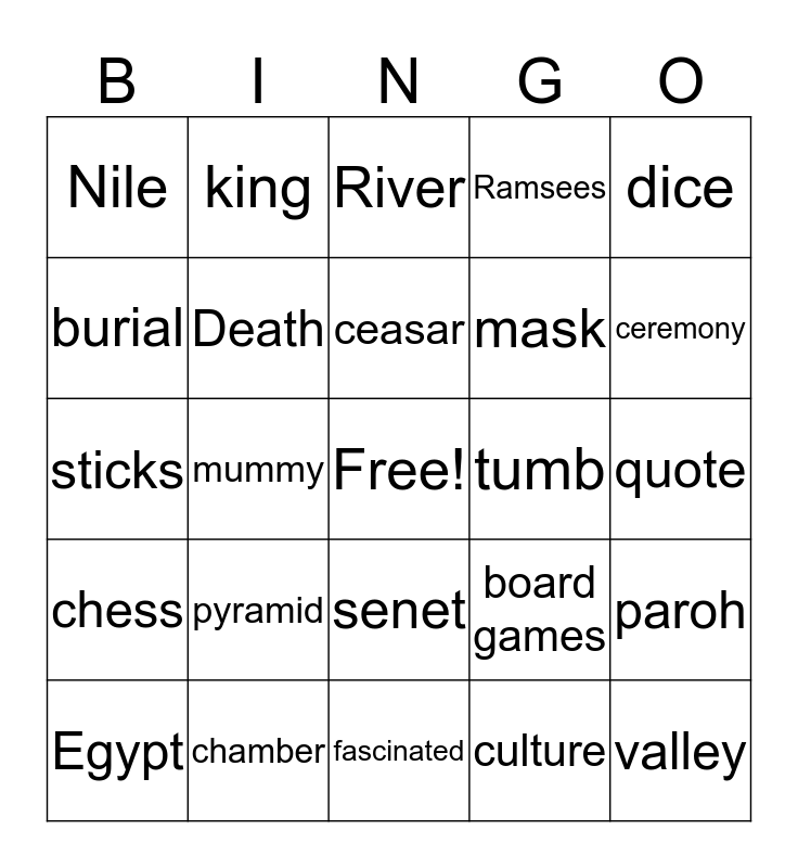 This bingo card has a free space and 29 words: Egypt, gold, mummy, boat, Nile, River, Death, pyramid, tumb, chamber, quote, valley, fascinated, culture, ceremony, archeology, senet, chess, dice, sticks, board games, pawn, mask, burial, Ramsees, king, paroh, ceasar and cat.