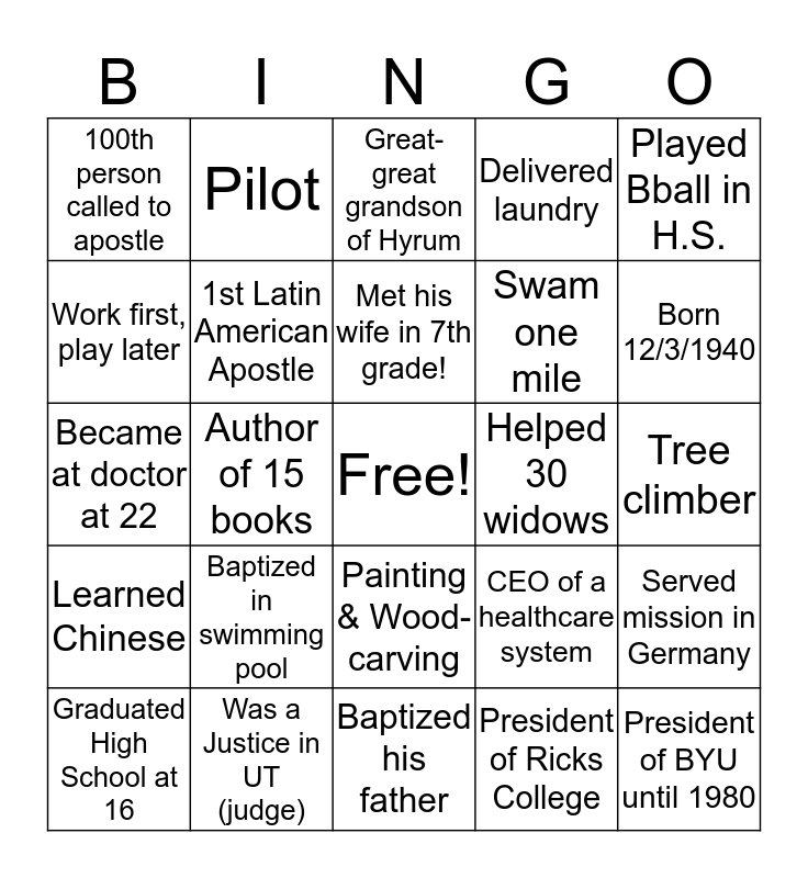This bingo card has a free space and 29 words: Graduated High School at 16, 1st successful Utah heart surgery, Author of 15 books, Born 8/12/32, 100th person called to apostle, Great-great grandson of Hyrum, 1st Latin American Apostle, Baptized in swimming pool, Helped 30 widows, Was a Justice in UT (judge), Tree climber, President of BYU until 1980, Baptized his father, President of Ricks College, Born 12/3/1940, Baked bread with his Mom, Painting & Wood-carving, Learned Chinese, Played Bball in H.S., Became at doctor at 22, CEO of a healthcare system, Prayed to find pet rabbit, Swam one mile, Work first, play later, Delivered laundry, Pilot, Served mission in Germany, Met his wife in 7th grade! and Saved baby lambs.