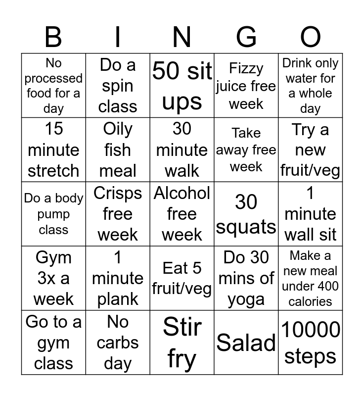 This bingo card has a free space and 24 words: 1 minute plank, No carbs day, 30 minute walk, Go to a gym class, Drink only water for a whole day, No processed food for a day, 15 minute stretch, Do a spin class, 30 squats, Eat 5 fruit/veg, Take away free week, Do a body pump class, Do 30 mins of yoga, Make a new meal under 400 calories, Oily fish meal, Salad, 1 minute wall sit, 50 sit ups, Try a new fruit/veg, Crisps free week, 10000 steps, Gym 3x a week, Fizzy juice free week and Stir fry.