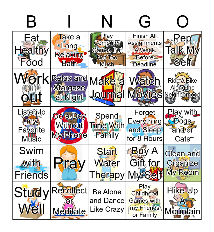 This bingo card has 23 images, a free space and 24 words: Pray, Recollect or Meditate, Make a Journal, Study Well, Pep Talk My Self, Eat Healthy Food, Work out, Take a Long Relaxing Bath, Forget Everything and Sleep for 8 Hours, Start Water Therapy, Watch Movies, Listen to my Favorite Music, Buy A Gift for My Self, Clean and Organize My Room, Relax and Stargaze at Night, Play Childhood Games with my Friends or Family, Play with Dogs and/or Cats, Play Computer Games But Not Too Much, Ride A Bike Along the Neighborhood, Go a Day Without My Phone, Hike Up A Mountain, Swim with Friends, Finish All Assignments A Week Before Deadline and Be Alone and Dance Like Crazy.