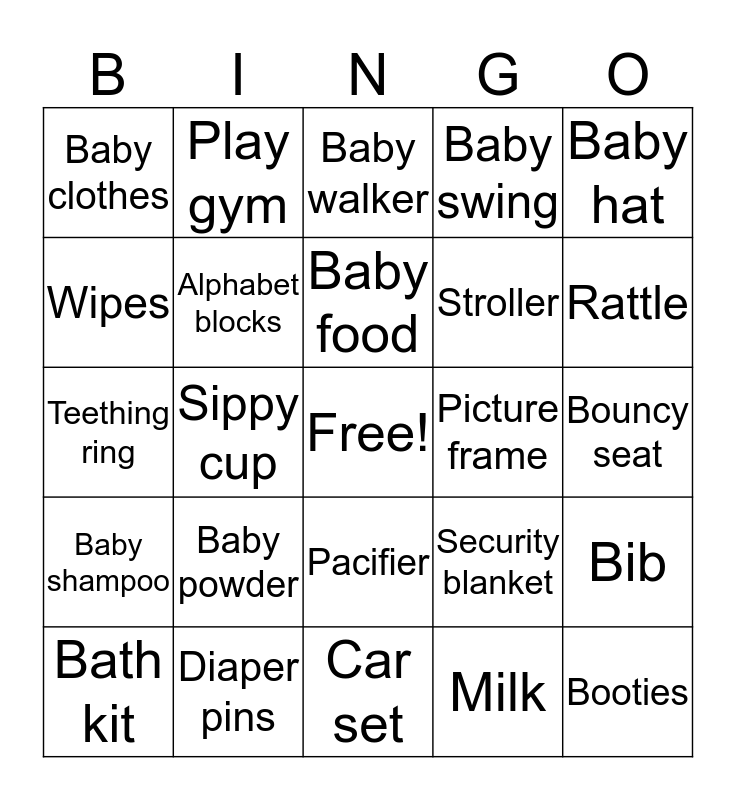 This bingo card has a free space and 33 words: Rubber duck, Burp cloth, Sippy cup, Cradle, Baby shampoo, Alphabet blocks, Baby hat, Bath kit, Play gym, Hooded towel, Baby food, Baby walker, Diapers, High chair, Picture frame, Rattle, Diaper pins, Teething ring, Baby powder, Security blanket, Pacifier, Changing pad, Baby clothes, Bouncy seat, Car set, Booties, Baby swing, Stroller, Wipes, Bib, Diaper bag, Milk and Baby bottle.