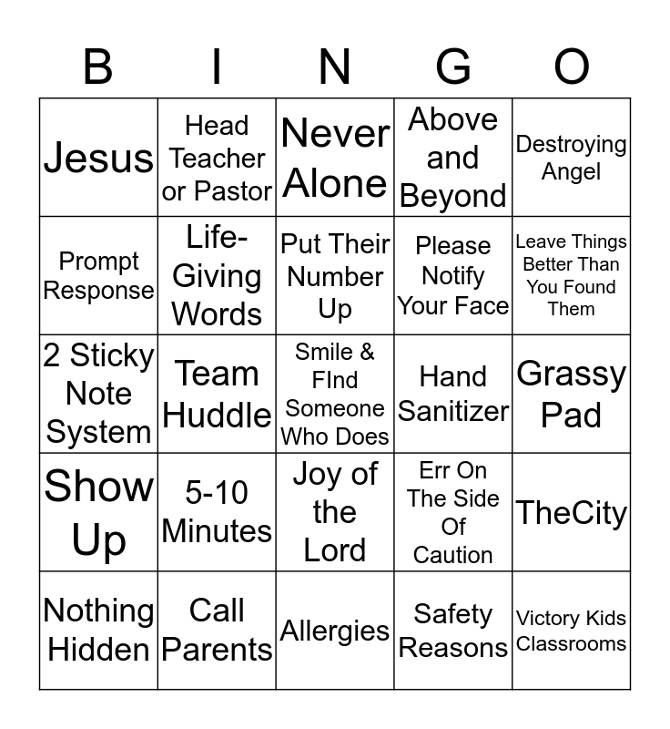 This bingo card has 34 words: Victory Kids Classrooms, Safety Reasons, "Ask Not", On Time, Show Up, Life-Giving Words, Destroying Angel, Nothing Hidden, Head Teacher or Pastor, Safety is Not Involved, Put Their Number Up, Never Alone, Security Nametag, Pick Up Slip, Hand Sanitizer, Leave Things Better Than You Found Them, Call Parents, 2 Sticky Note System, 5-10 Minutes, Err On The Side Of Caution, Joy of the Lord, Powerful, Jesus, Grassy Pad, Allergies, Smile & FInd Someone Who Does, Above and Beyond, Jesus with Wild Abandonment, Please Notify Your Face, Prompt Response, Rely on You, Team Huddle, TheCity and YOU.