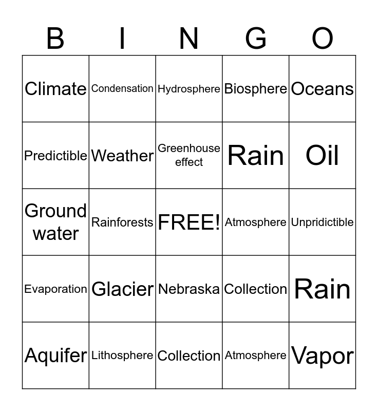 This bingo card has a free space and 24 words: Glacier, Lithosphere, Greenhouse effect, Aquifer, Oceans, Climate, Predictible, Condensation, Atmosphere, Nebraska, Rain, Ground water, Collection, Rain, Weather, Atmosphere, Unpridictible, Hydrosphere, Oil, Rainforests, Vapor, Evaporation, Biosphere and Collection.